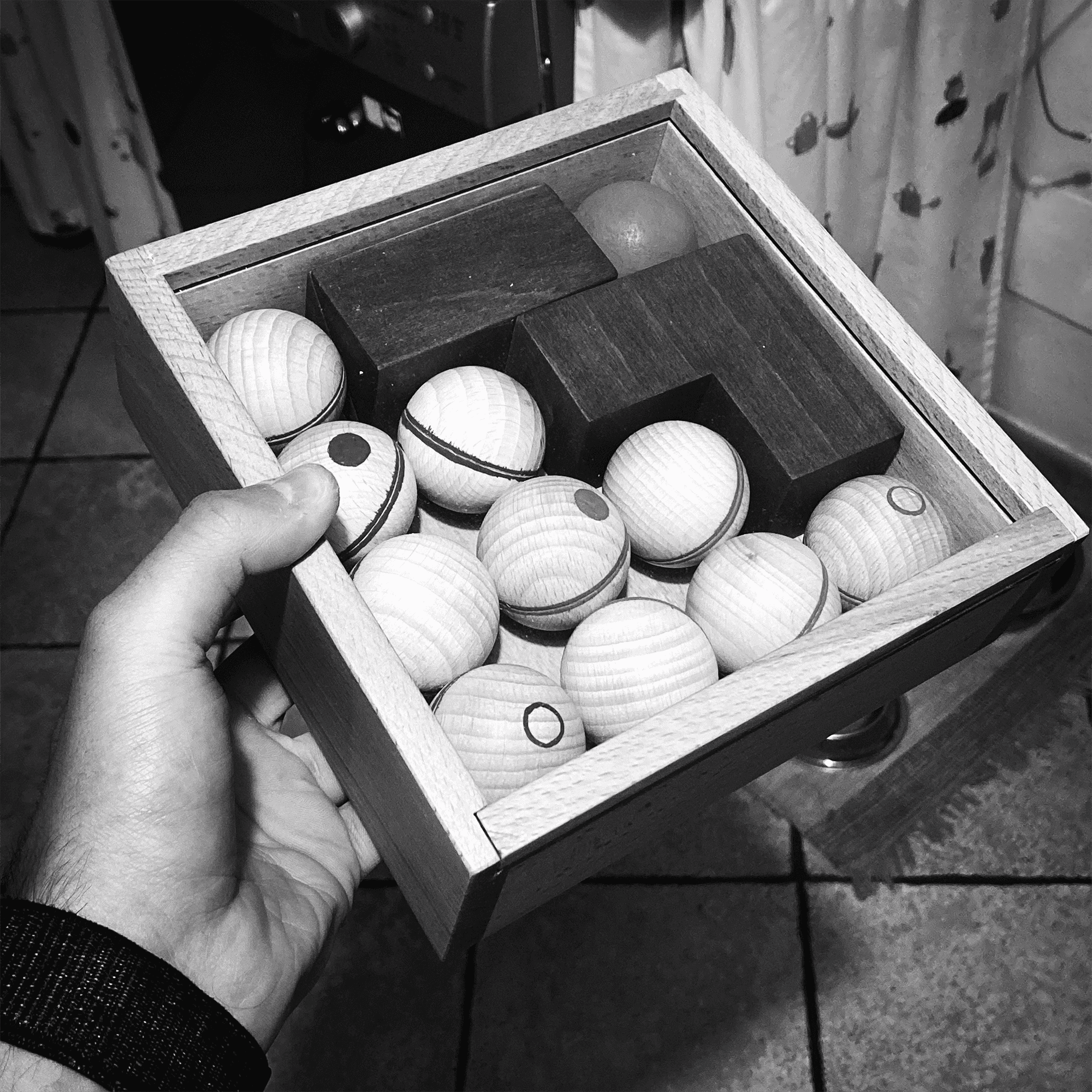 Crafted from wood, Bilico features unique spheres with internal asymmetrical cavities. Some spheres contain fixed metal weights, while others have moving weights, resulting in distinct movement patterns. Each sphere's asymmetry is marked, allowing players to predict and adapt their strategies. Identical pairs of spheres ensure fair play for both teams.